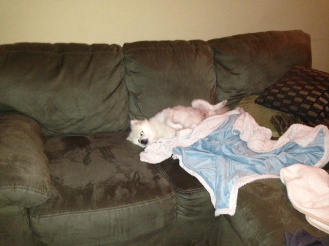 Can’t forget about the furr kid…all the adventure this weekend left him pretty tuckered out. This is what we saw coming out into the living room after putting Liam to sleep Sunday night. Only one word to describe this: pathetic …well maybe cute, too.