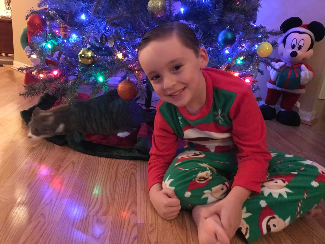 Last, but most certainly not least, we took our annual PJ pictures by the Christmas tree. We tried to get both Timber & Simba this year with Liam, but Simba (as you can imagine for a cat) was not cooperating. Actually, in Timber’s pic below, Simba is behind them….you just can’t see it. Haha! This pic of Simba is as good as it gets.